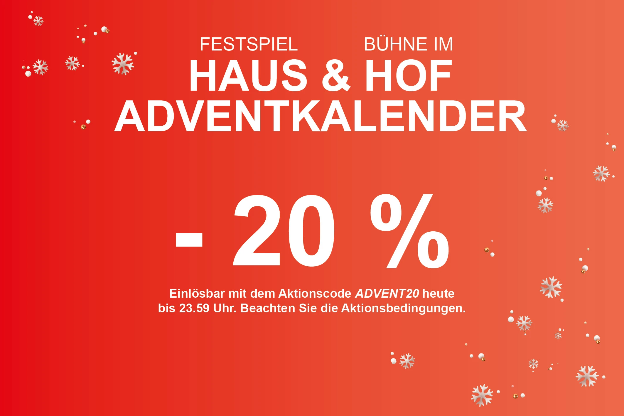 Am heutigen Adventsonntag erhalten Sie mit dem Promotioncode "ADVENT20" eine Ermäßigung von 20% auf alle Veranstaltungen in der Bühne im Hof und im Festspielhaus St. Pölten.