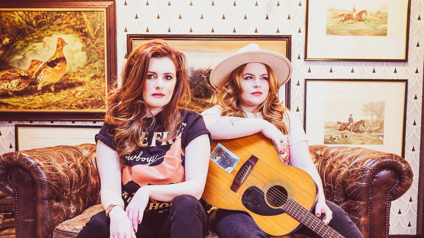 Cassie und Maggie sitzen lässig auf einem braunen Ledersofa in einem rustikal dekorierten Raum mit Jagdtrophäen und Gemälden, wobei eine eine Gitarre hält und beide direkt und selbstbewusst in die Kamera blicken.