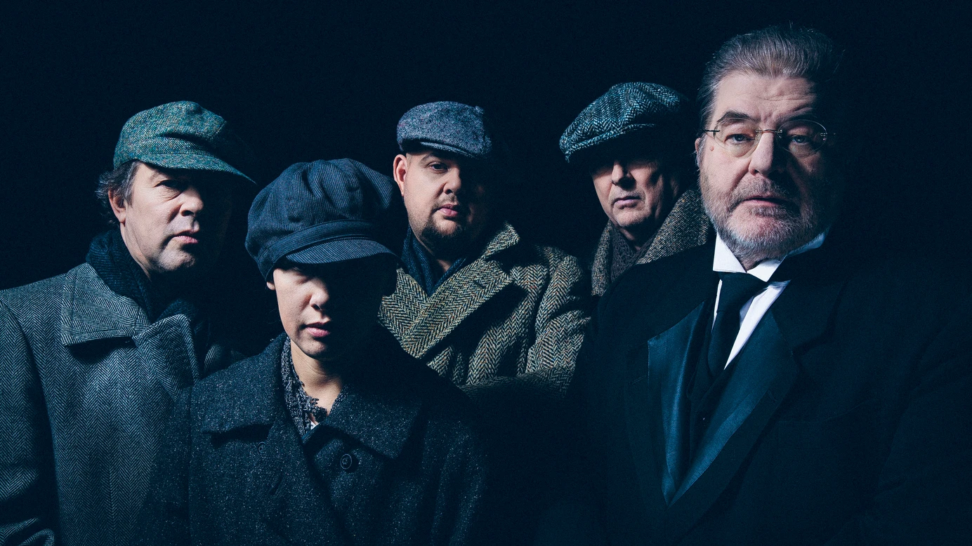 Fünf Personen in dunkler, altertümlich wirkender Kleidung und Schirmmützen stehen dicht beisammen vor schwarzem Hintergrund und blicken ernst in die Kamera, wobei Erwin Steinhauer rechts im eleganten Anzug hervorsticht.