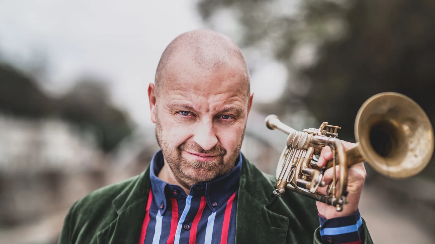 Thomas Gansch mit Stopelglatze, kurzem Bart und farbig gestreiftem Hemd unter einer grünen Samtjacke blickt selbstbewusst in die Kamera, während er eine goldene Trompete locker über der Schulter hält.