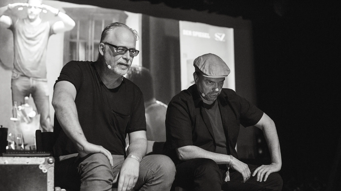 Peter Hörmanseder und Robert Stachel sitzen auf einer dunklen Bühne mit amüsiertem und ernstem Ausdruck nebeneinander, während hinter ihnen auf einer großen Leinwand eine Szene aus einer Nachrichtensendung projiziert wird.