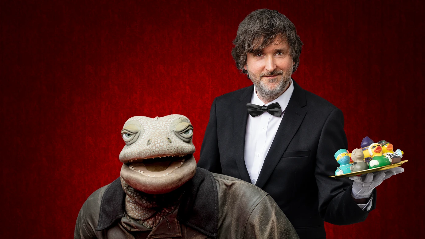 Michael Hatzius steht im Smoking vor einem roten Hintergrund und hält ein Tablett mit bunten Plastikenten, während neben ihm die Echse in brauner Kleidung sitzt und eine Zigarre in der Hand hält.