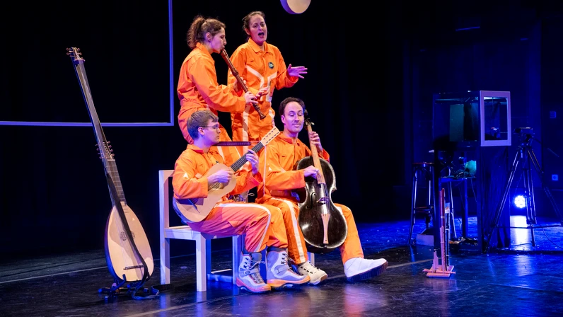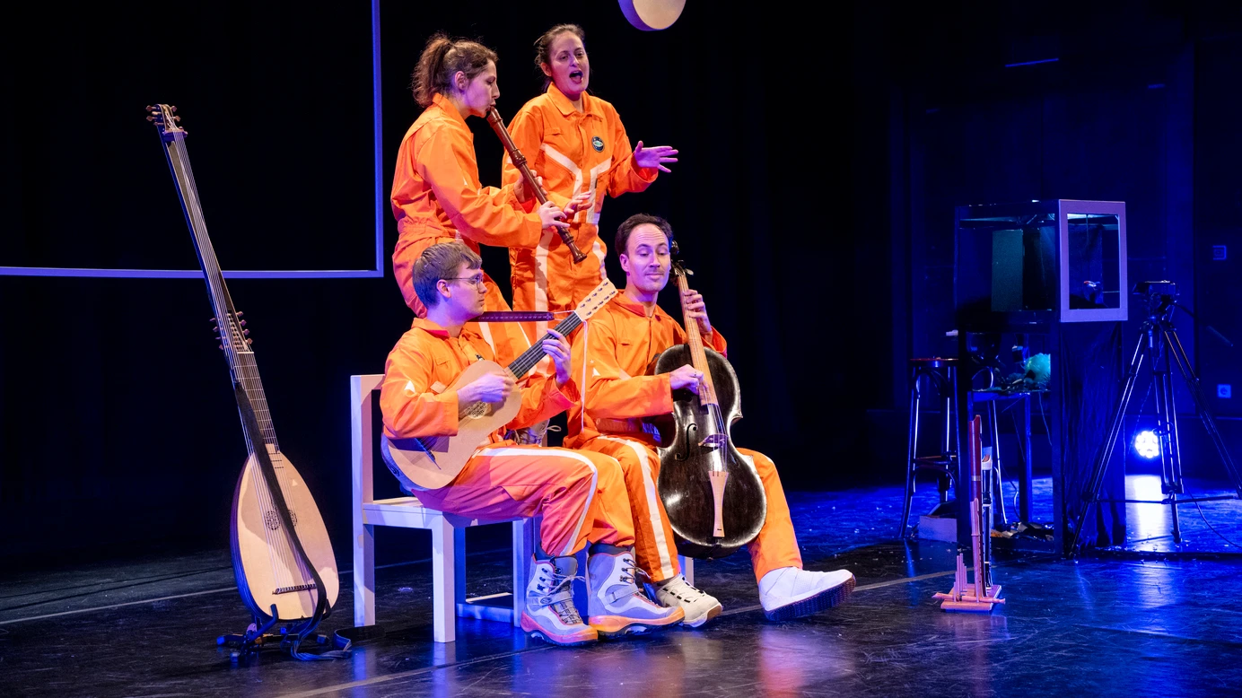 Auf ins Universum! Unter der Regie von Christoph Steiner reist das Ensemble infiammabile ins All und hat allerlei ungewöhnliche Instrumente im Gepäck – von der Barockgitarre bis zur Theorbe. Auf dem Flug erklingen Melodien aus Renaissance, Barock und dem 20. Jahrhundert, die Komponist Michael Stark mit zeitgenössischer Musik verbindet. Dank des einfallsreichen Bühnenbildes von Leonie Bramberger kommt auf dem kuriosen Planeten allerhand Unerwartetes zum Vorschein …