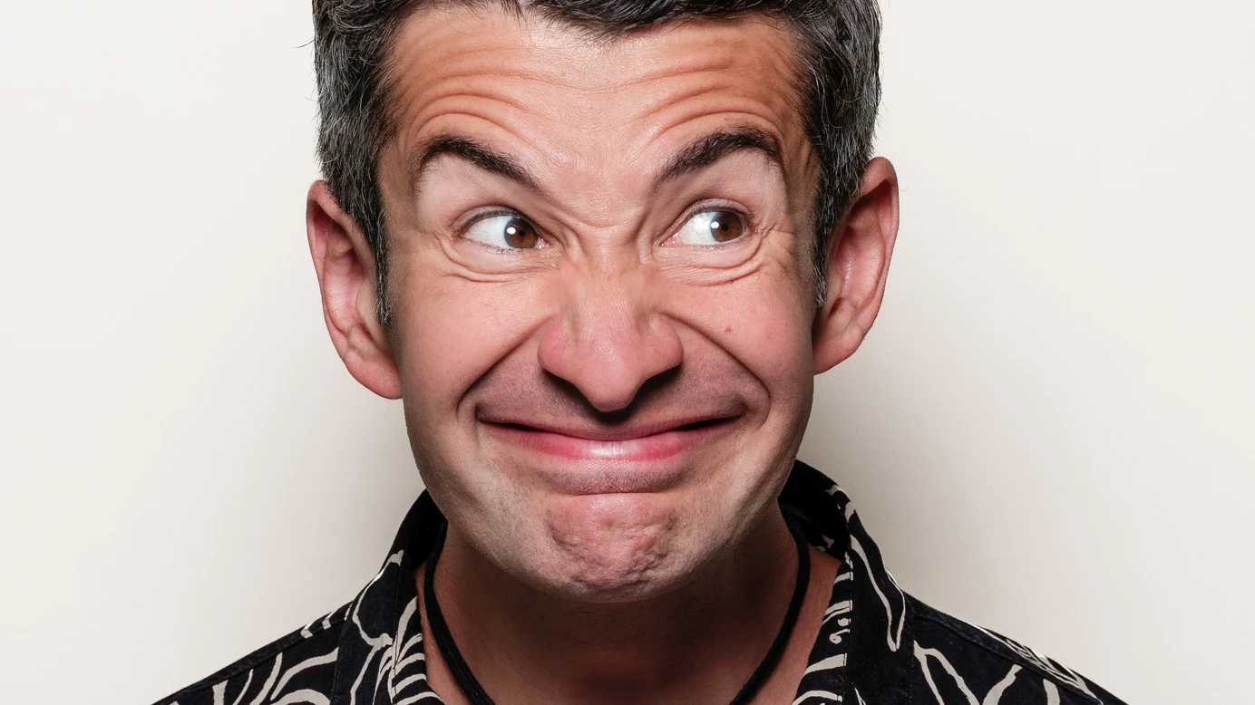 Omar Sarsam schaut mit dunklem, kurz gelocktem Haar und gemustertem Hemd lächelnd mit übertrieben verzogenem, komödiantischem Gesichtsausdruck schräg nach oben vor hellem Hintergrund.