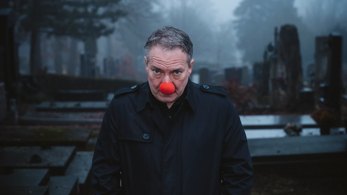 Robert Palfrader steht mit schwarzem Mantel und roter Clownsnase nach vorn gebeugt und ernst blickend auf einem nebligen Friedhofsweg zwischen Gräbern.