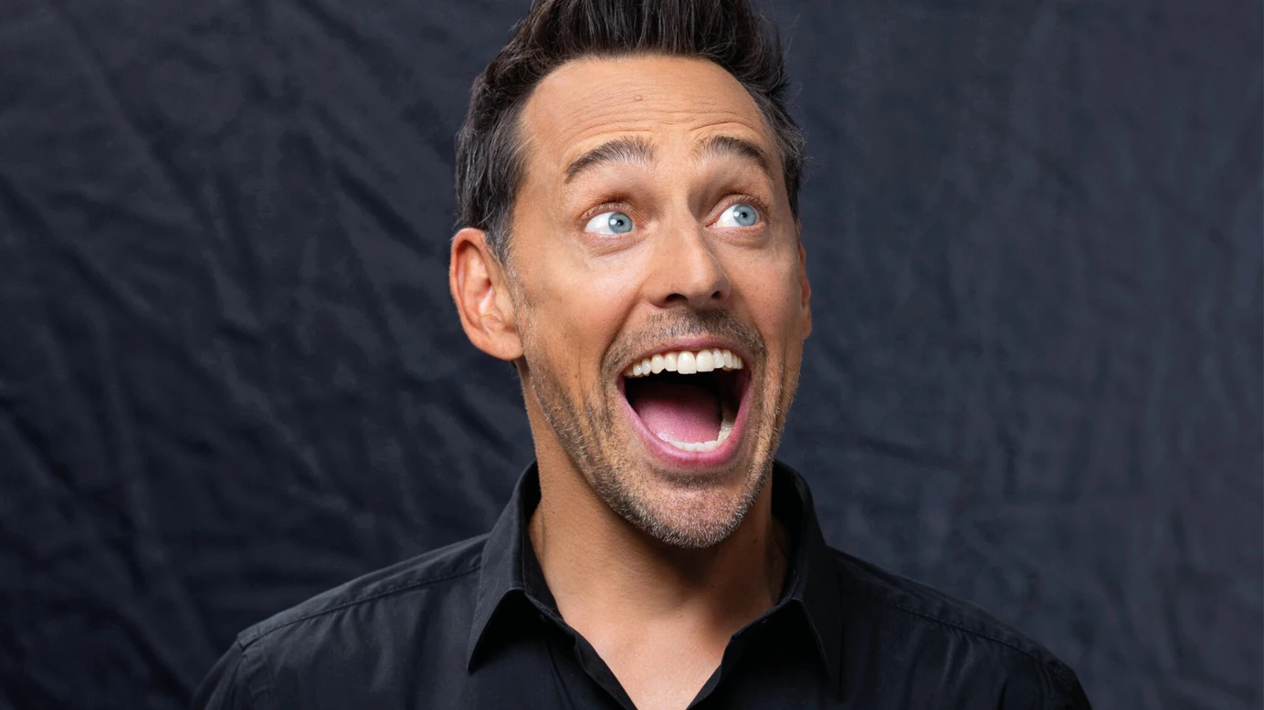 Tricky Niki steht mit schwarzem Hemd vor dunklem Hintergrund und lacht mit weit geöffnetem Mund nach rechts oben, als wäre er überrascht oder begeistert.
