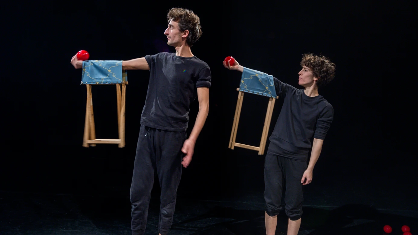 Zwei Künstler:innen in schwarzer Kleidung balancieren jeweils einen kleinen Hocker auf ihrem ausgestreckten Arm, während sie rote Jonglierbälle halten und die Wand auf einer dunklen Bühne konzentriert anschauen.