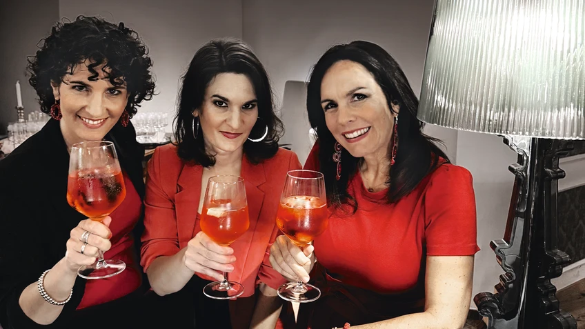 Vor rosa Hintergrund streckt Antonia Stabinger in glitzerndem pinken Blazer freundlich die Hand zur Kamera aus, während links daneben zwei runde Porträts weiterer Frauen eingeblendet sind – Marlene Engelhorn lächelnd mit kurzem Haar, Ankathie Koi im 80er‑Jahre‑Look mit voluminöser Frisur.