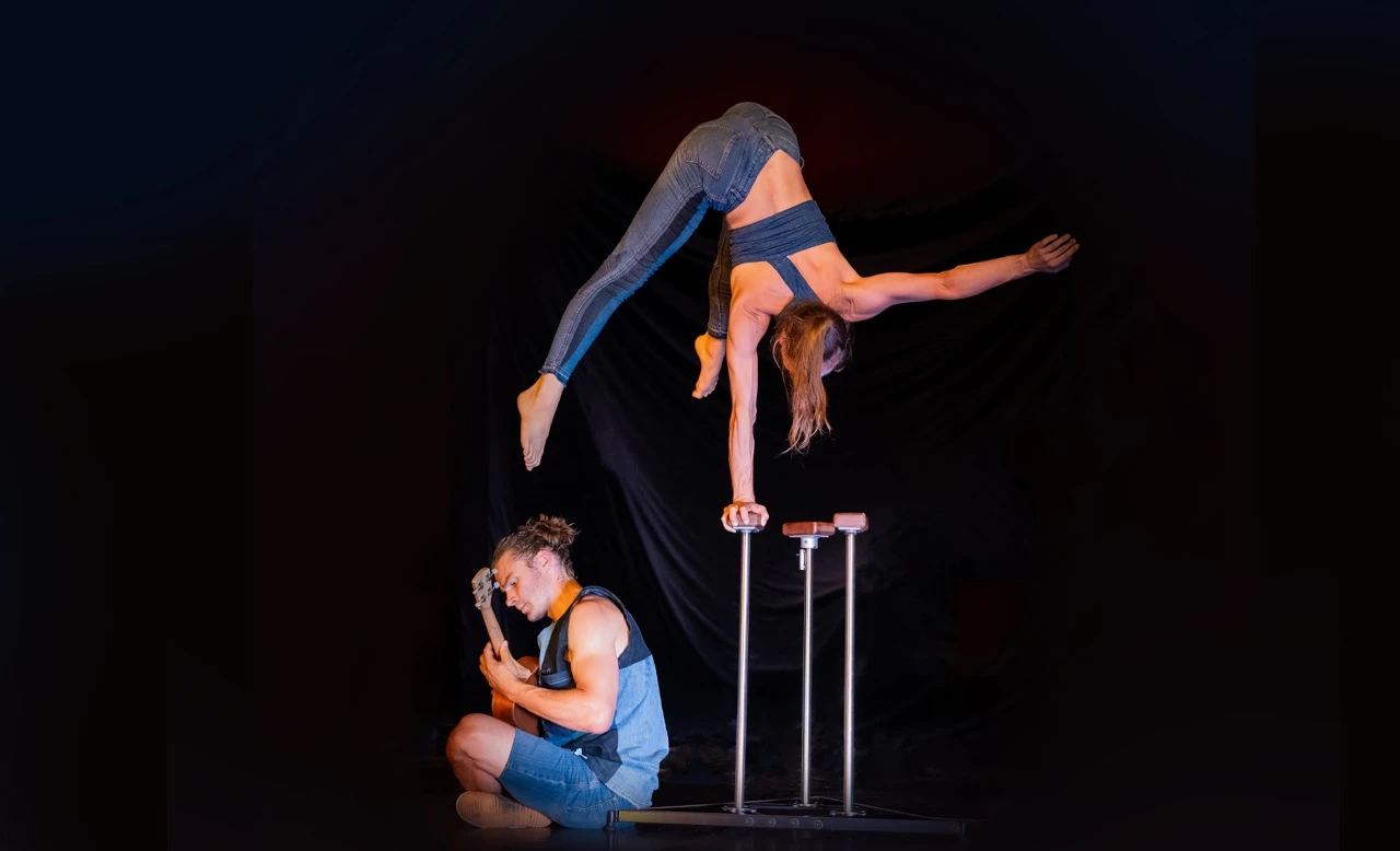Eine Artistin steht in einem einarmigen Handstand auf erhöhten Handstandstützen, während neben ihr ein Musiker im Sitzen Gitarre spielt, beide in sportlicher Kleidung vor dunklem Hintergrund.